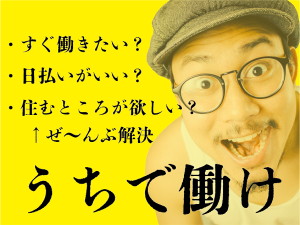 | 待遇・福利厚生 | ●急な出費も安心! 「全額日払い制」 →勤務後、当日に現金手渡し! ★友達と食事!デート!レジャー!など 遊び予定に合わせて働いて現金をゲットできます! ●経験や資格に応じて日給アップ! ●残業時は別途、残業手当を支給 【特別入社手当】 ・作業用品プレゼント ・寮費1ヶ月無料 ※すべて当社規定により支給。 |